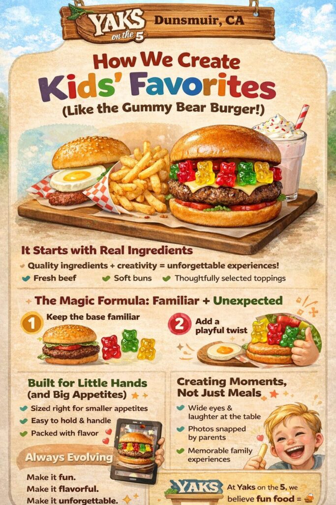 At “Yaks on the 5″,”Dunsmuir, CA, US”, we believe food should be fun, especially for kids. That’s why our kids’ menu isn’t an afterthought. It’s carefully crafted to spark excitement, curiosity, and big smiles from the very first bite.