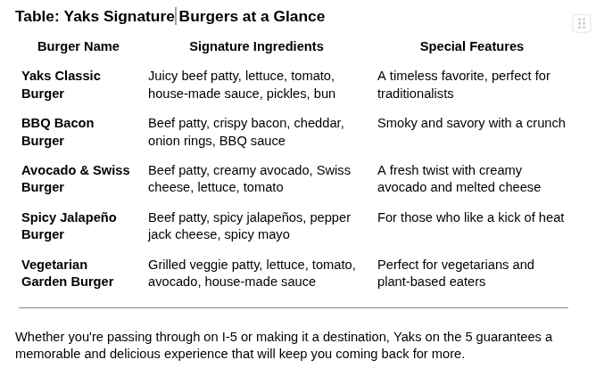 And why would the Yaks on the 5 be on your radar? Now, let us explore why their signature burgers, gourmet creations, and culinary original burgers make it a must visit destination.